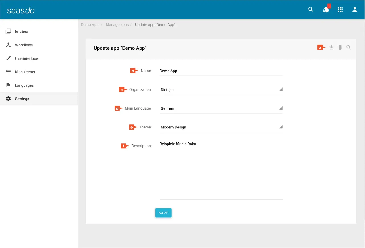Im Bereich Settings kannst du die Einstellungen deiner App einsehen und bearbeiten. Der Bereich kann im Ansichtsmodus oder im Bearbeitungsmodus angezeigt werden.