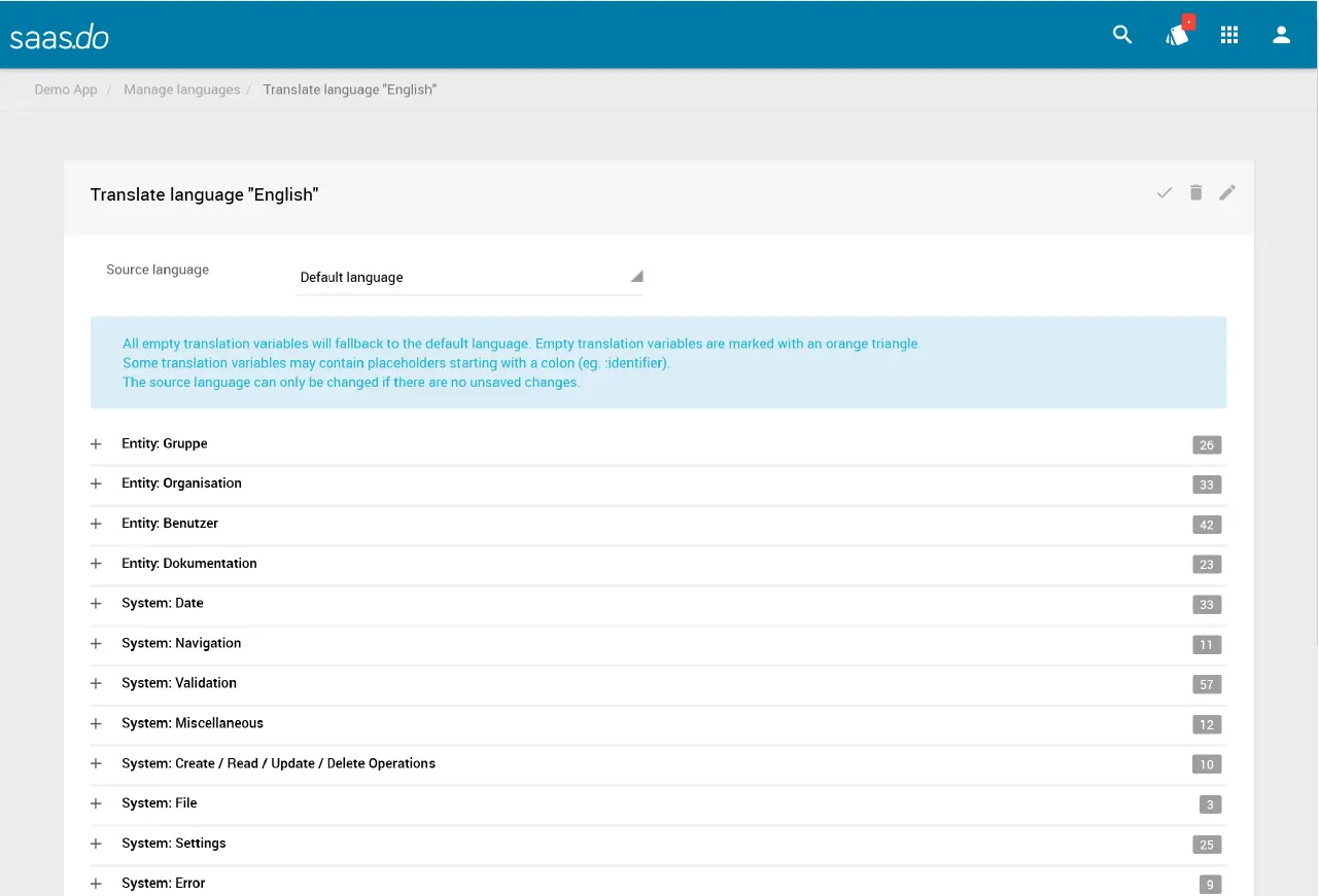 - Gruppen mit übersetzbaren Begriffen aus der App (z. B. Entitäten, Workflows, System-Begriffe). Eine Gruppe kann über das + geöffnet werden.