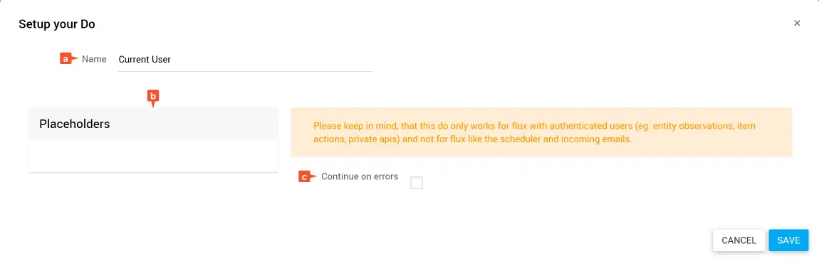 Dieser Baustein arbeitet mit Workflows zusammen, in denen sich Benutzer authentifizieren (zum Beispiel Login, Entity Change, Item Actions). Er arbeitet nicht zusammen mit Workflows und Triggern ohne Authentifizierung, wie dem Scheduler oder Incoming E-Mail.