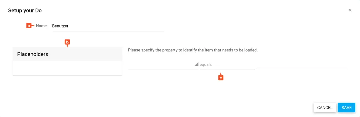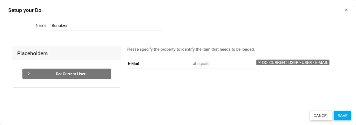 - Definition der Vergleichsoperation nach dem Schema "Datenfeld entspricht Wert". Anhand dieser wird der gesuchte Datensatz geladen. Die Auswahl des linken Dropdown-Feldes entspricht den Datenfeldern der ausgewählten Entity.