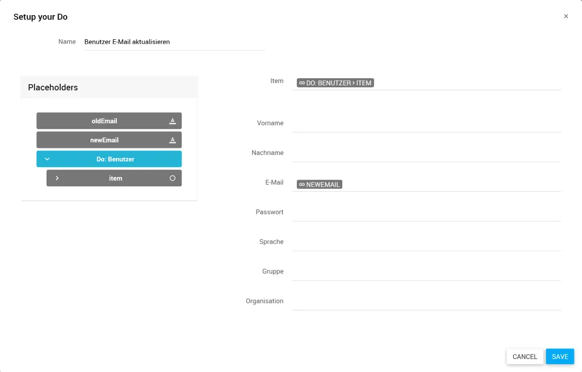 Gib in den Datenfeldern der Entität die neuen Daten ein oder ziehe Platzhalter aus den Placeholders hinein. Leergelassene Felder behalten ihren bisherigen Wert.