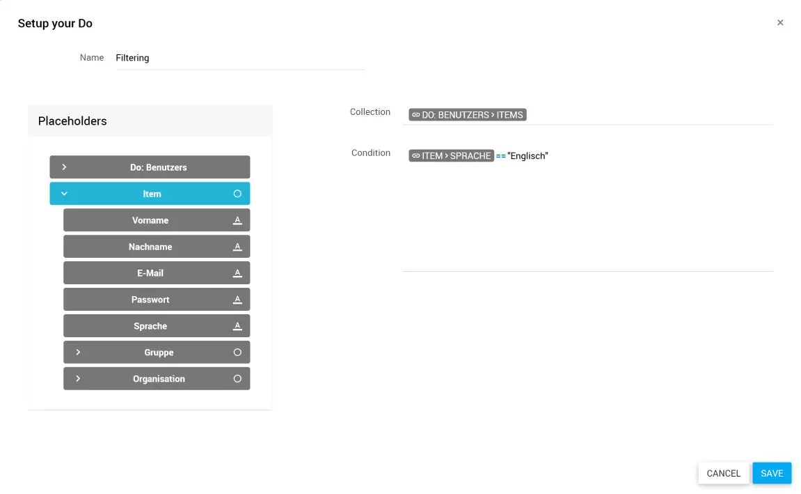 Mit dem Baustein Filtering kannst du die Datensätze einer Collection nach einem bestimmten Datenfeld und Wert filtern.