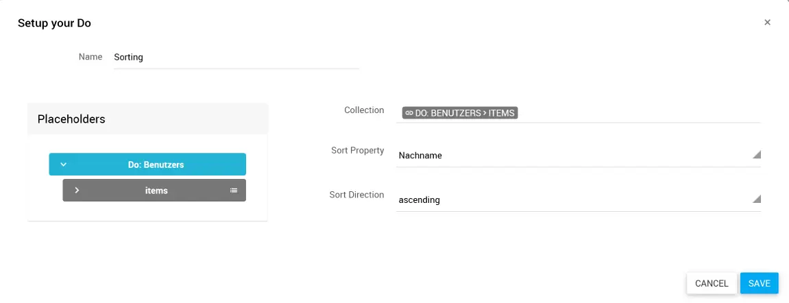 Mit dem Baustein Sorting kannst du die Datensätze einer Collection nach einem bestimmten Datenfeld neu sortieren.