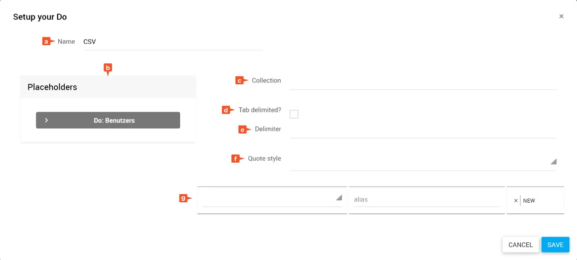 Definiere im unteren Teil der Konfiguration die Datenfelder, die in dem CSV-String enthalten sein sollen. Mit NEW kannst du ein weiteres Datenfeld hinzufügen und mit x ein Datenfeld löschen. Optional kannst du unter alias eine alternative Bezeichnung für das jeweilige Datenfeld eingeben.