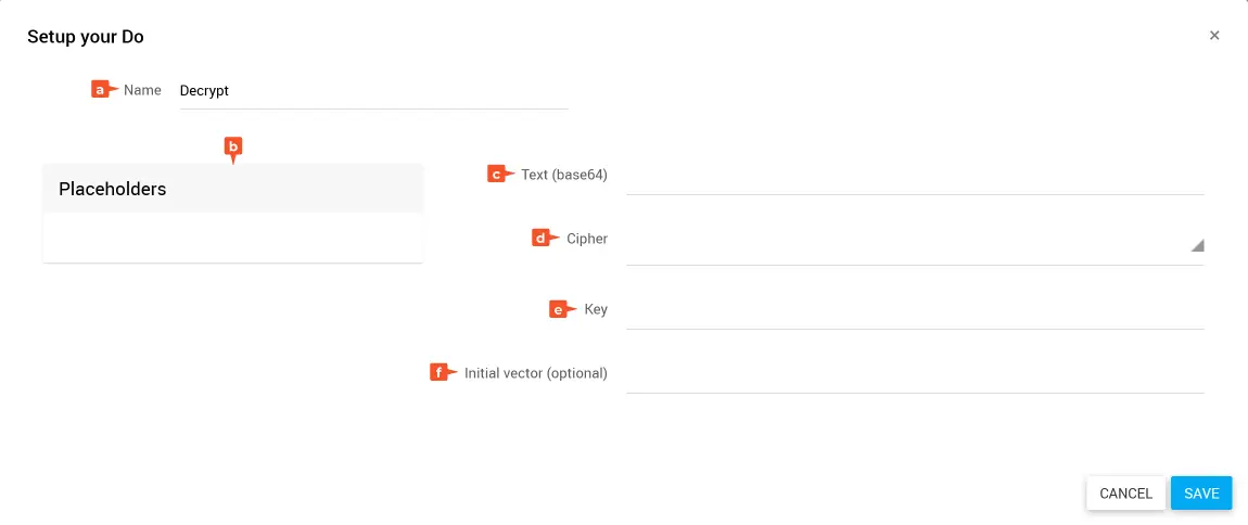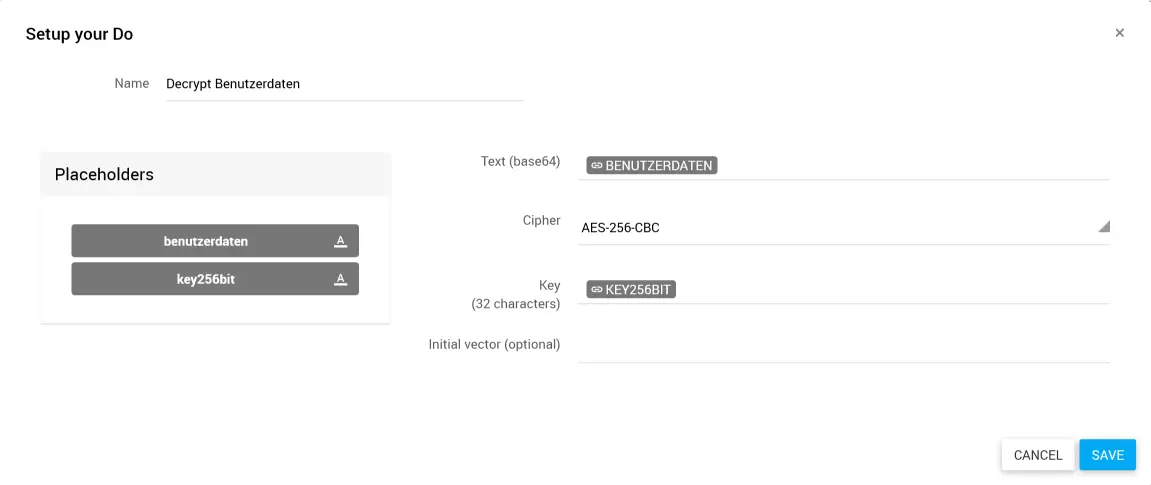 Gib optional einen Initialisierungsvektor im Feld Initial vector ein oder ziehe einen entsprechenden String aus den Placeholders hinein.