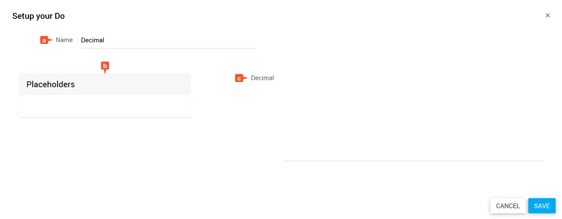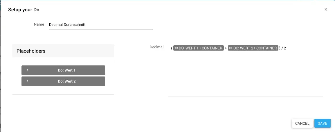 Gib im Feld Decimal einen Wert oder eine Berechnung ein. Hierfür kannst du Platzhalter, Accessoren und Operatoren verwenden. Beachte bei einer händischen Eingabe die Konventionen unter Datentypen.