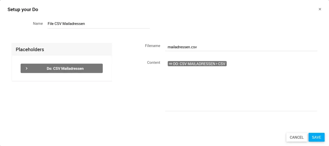 Ziehe den Platzhalter mit dem Datei-Inhalt aus den Placeholders in das Feld Content.