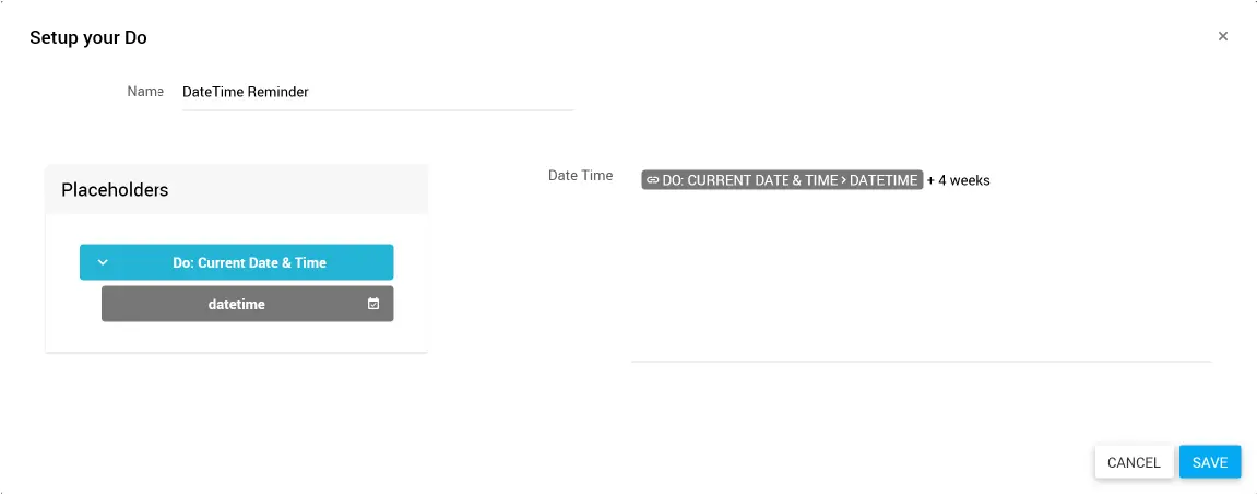 Im weiteren Verlauf des Workflows steht dir der DateTime-Container als Platzhalter zur Verfügung.
