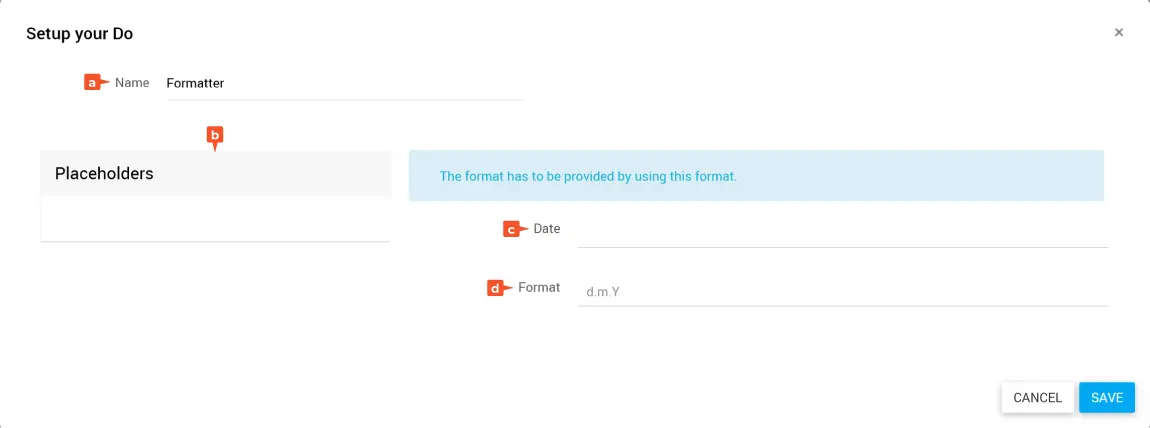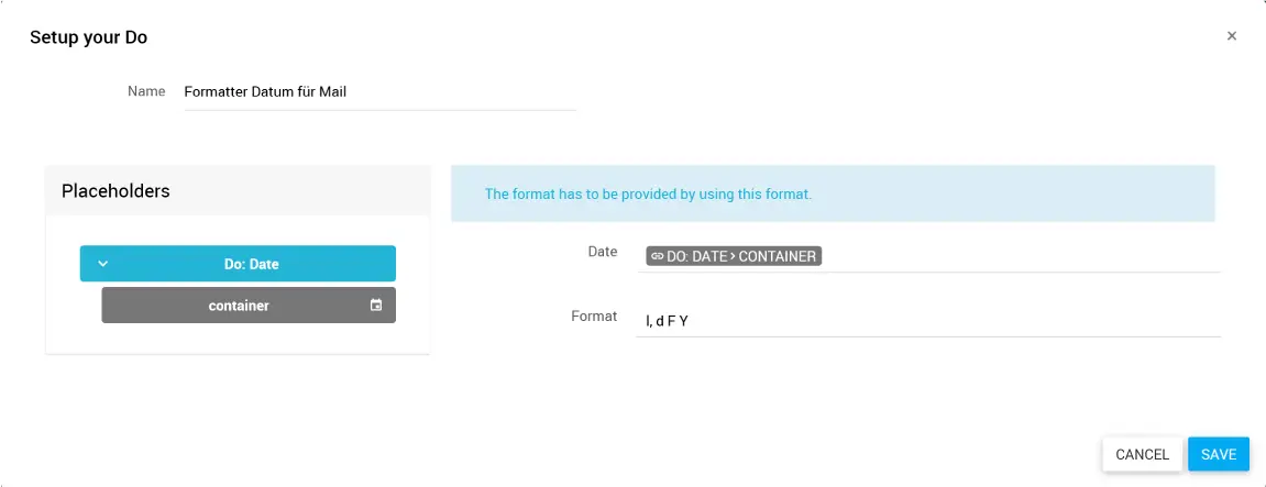Gib ein Datum in das Feld Date ein oder ziehe einen Platzhalter vom Datentyp Date aus den Placeholders hinein.