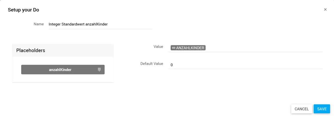 Gib im Feld Name eine treffende Bezeichnung ein. Zum Beispiel: „Integer Standardwert anzahlKinder“