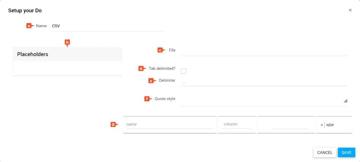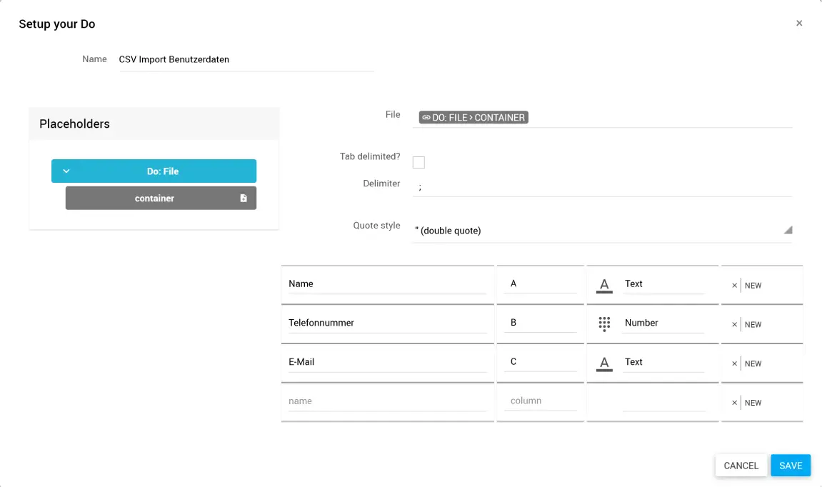 Ziehe den Platzhalter, der die CSV-Datei enthält, aus den Placeholders in das Feld File.