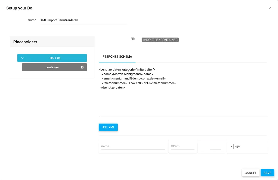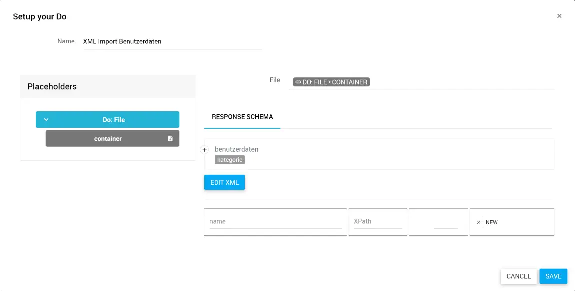 - File: Definition der XML-Datei, aus der die Daten importiert werden sollen. Die Datei als Input musst du zuvor im Workflow bereitstellen.