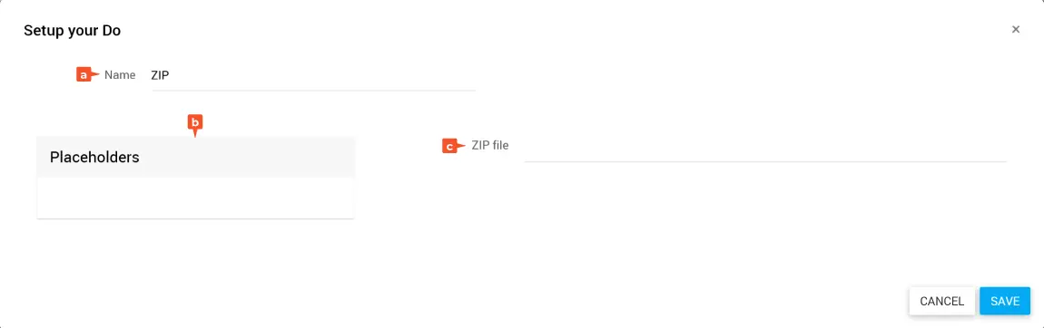 Ziehe die Datei, die entpackt werden soll, aus den Placeholders in das Feld Files.