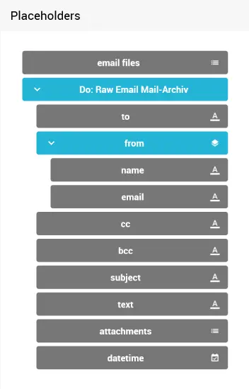 Mit dem Baustein Raw Email kannst du E-Mail-Daten, wie Empfänger, Absender, Nachrichtentext und Anhänge, aus dem Header und dem Quelltext einer E-Mail auslesen. Die Daten werden hierbei automatisch extrahiert und stehen dir anschließend im Workflow zur Verfügung.