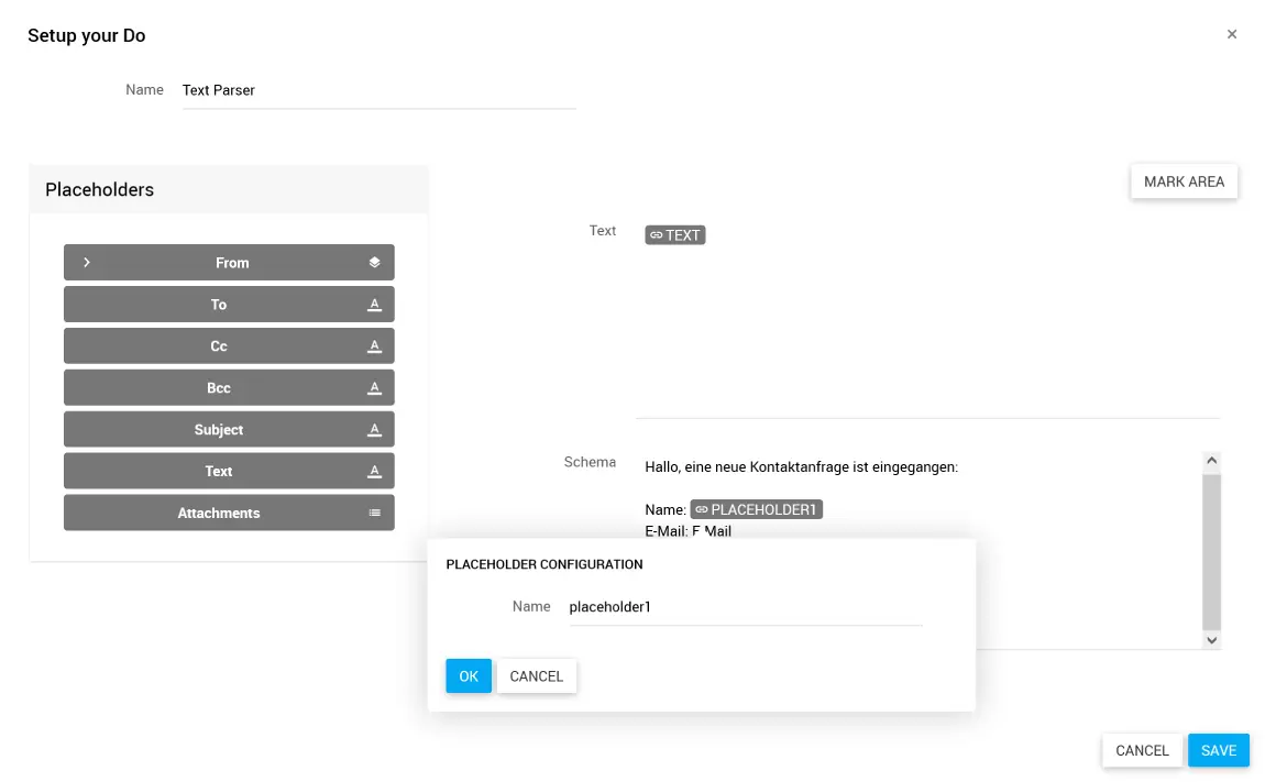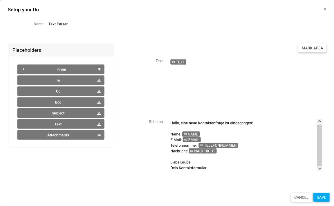Mit dem Baustein Text Parser kannst du bestimmte Abschnitte eines Textes auslesen und anhand eines definierten Schemas in Daten umwandeln. Diese Daten stehen dir anschließend im Workflow zur Verfügung.