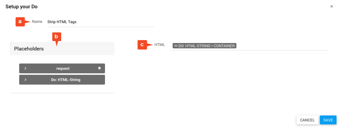 - Name: Bezeichnung des Bausteins (z. B. „Strip HTML Tags“)