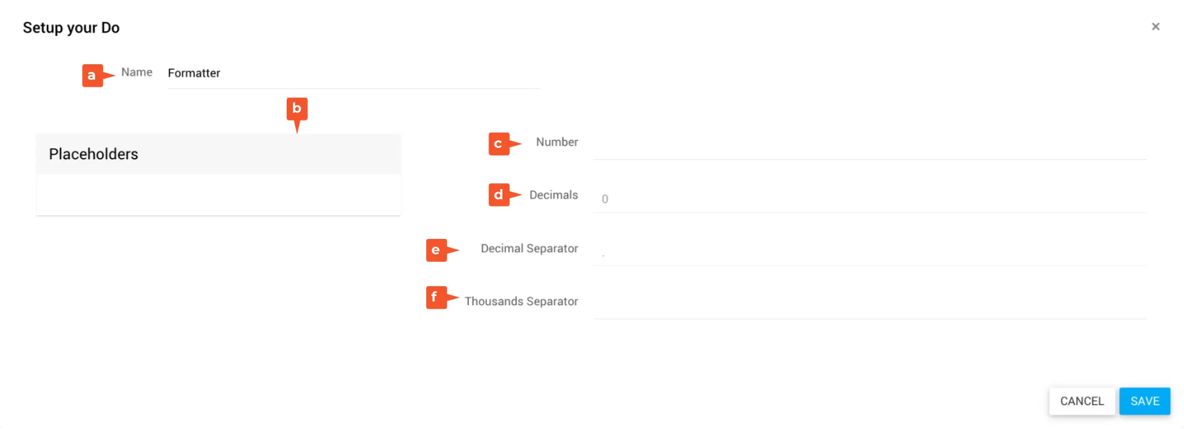 Gib ein Zahlenwert (Integer oder Decimal) in das Feld Number ein oder ziehe einen Platzhalter vom Datentyp Integer oder Decimal aus den Placeholders hinein.