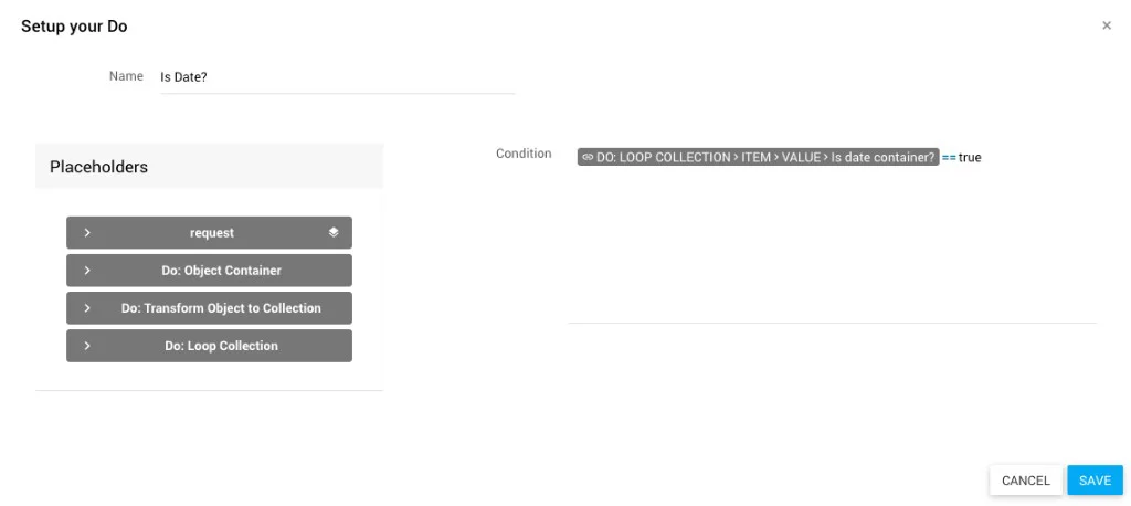 Konfiguration der Condition: Der value des aktuellen Loop-Items wird mit dem Accessor abgefragt, z. B. DO: LOOP COLLECTION > ITEM > VALUE > Is date container? == true.