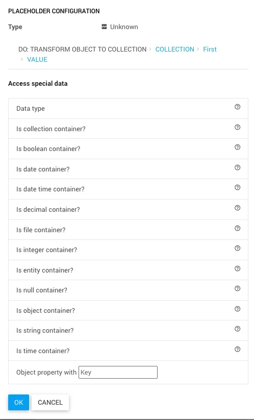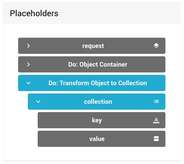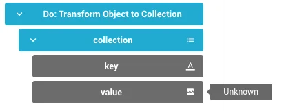 Mit dem Baustein Transform Object to Collection wandelst du ein Objekt in eine Collection of Objects um. Jede Eigenschaft des Eingabe-Objekts wird zu einem Eintrag in der Collection mit den Feldern key (Name der Eigenschaft) und value (Wert der Eigenschaft).