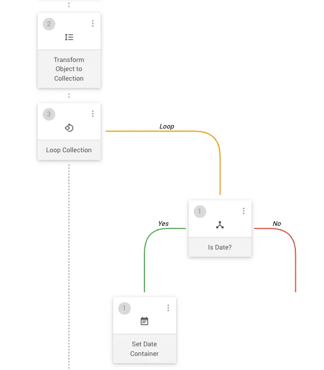 - Set Date Container (z. B. nur im „Yes“-Zweig) – value in einen Date-Container übernehmen.