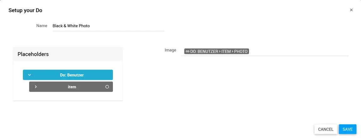 Ziehe den Platzhalter mit der Bilddatei aus den Placeholders in das Feld Image.