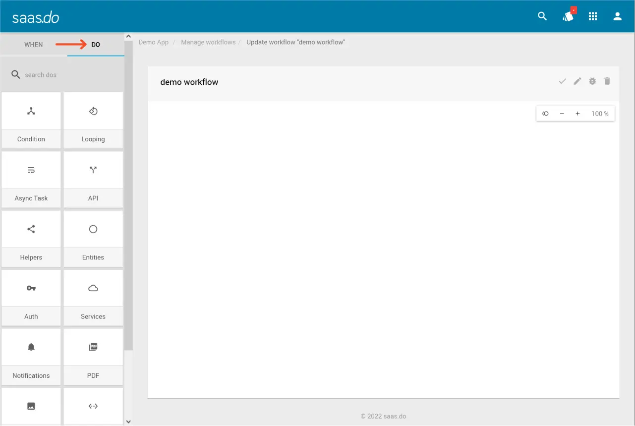 Dos sind Bausteine die bestimmte Aktionen im Workflow ausführen und Aufgaben erledigen. Wenn ein Workflow durch einen When-Trigger gestartet wird, werden die Do-Bausteine sequenziell durchlaufen. Die Bausteine lassen sich miteinander kombinieren und somit lassen sich komplexe Prozessabläufe abbilden.