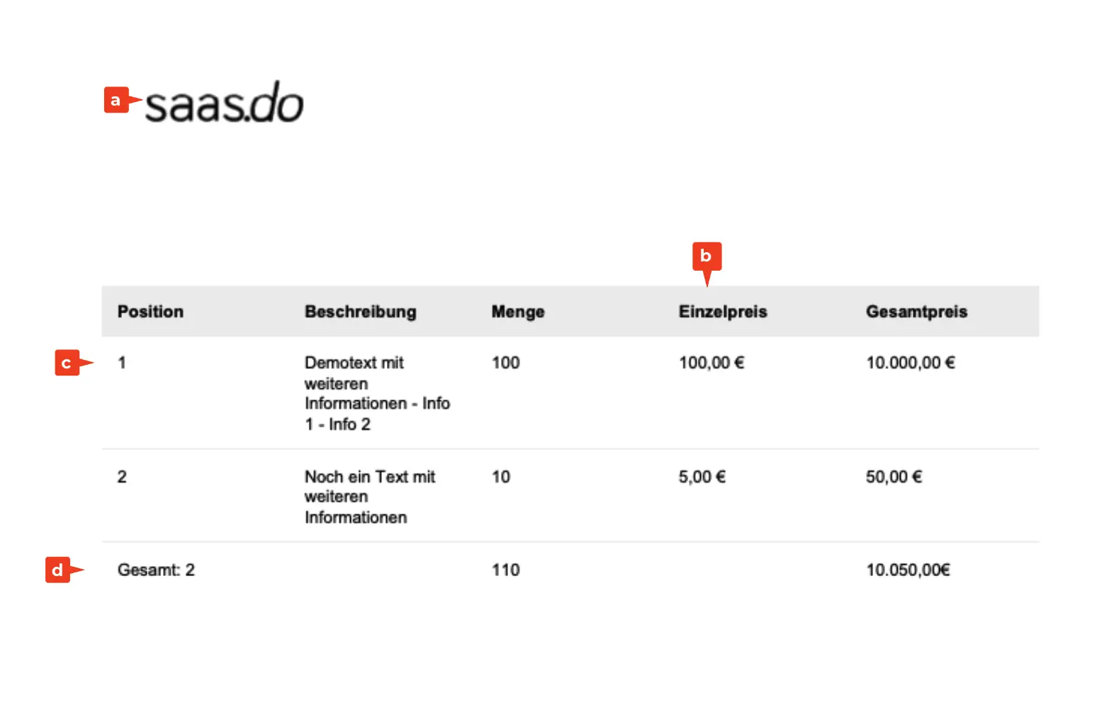 - Die Objekte in tablePositions und tableFooter müssen die selben Feldnamen enthalten, wie tableHeader