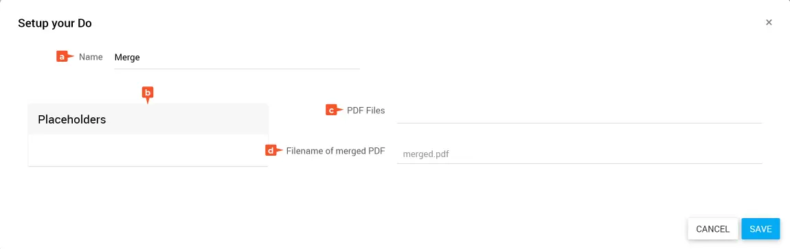 - PDF Files: Definition der PDF-Dateien, die zusammengeführt werden sollen. Die Dateien als Input musst du zuvor im Workflow bereitstellen.
