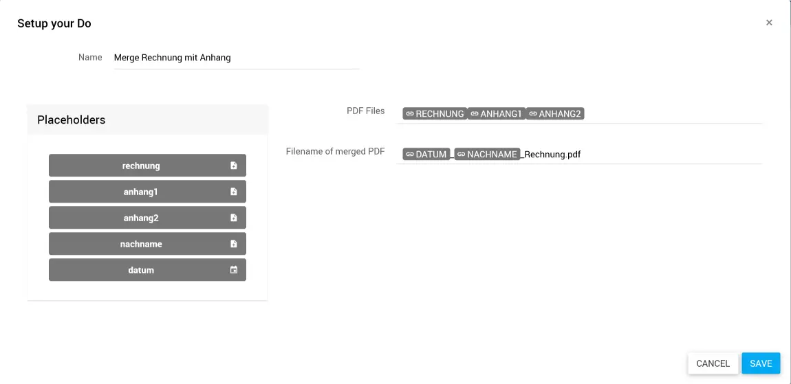 Gib im Feld Name eine treffende Bezeichnung ein. Zum Beispiel: „Merge Rechnung mit Anhang“