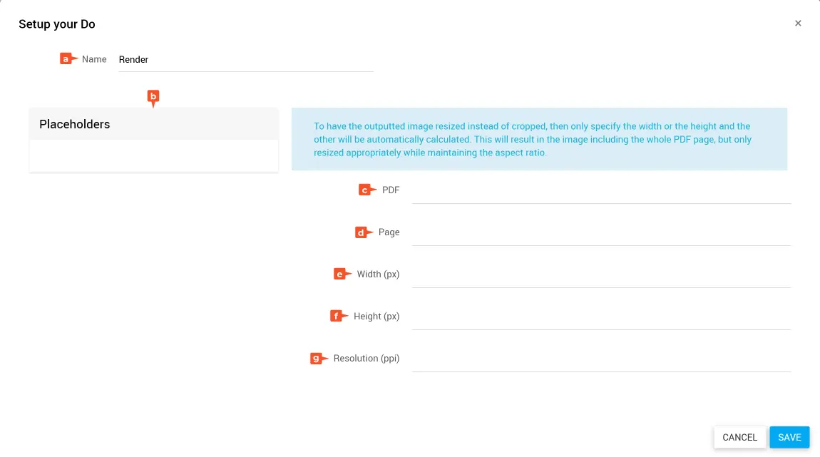 Ziehe den Platzhalter mit der PDF-Datei aus den Placeholders in das Feld PDF.