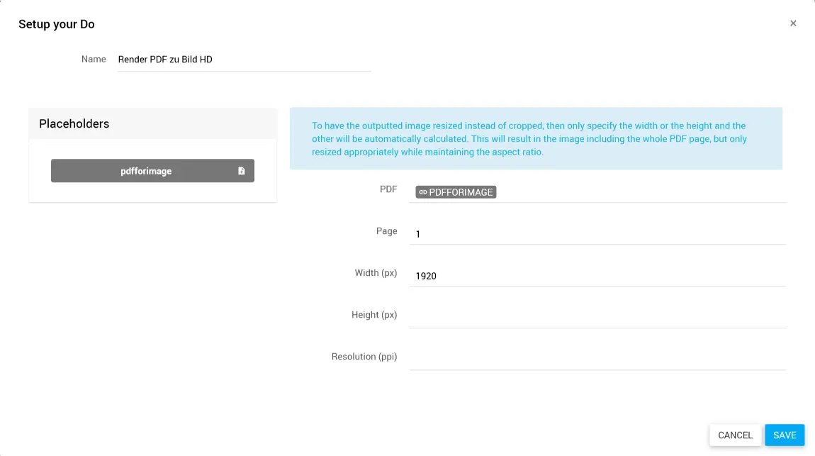 - PDF: Definition der PDF, die erstellt werden soll. Die Datei als Input musst du zuvor im Workflow bereitstellen.