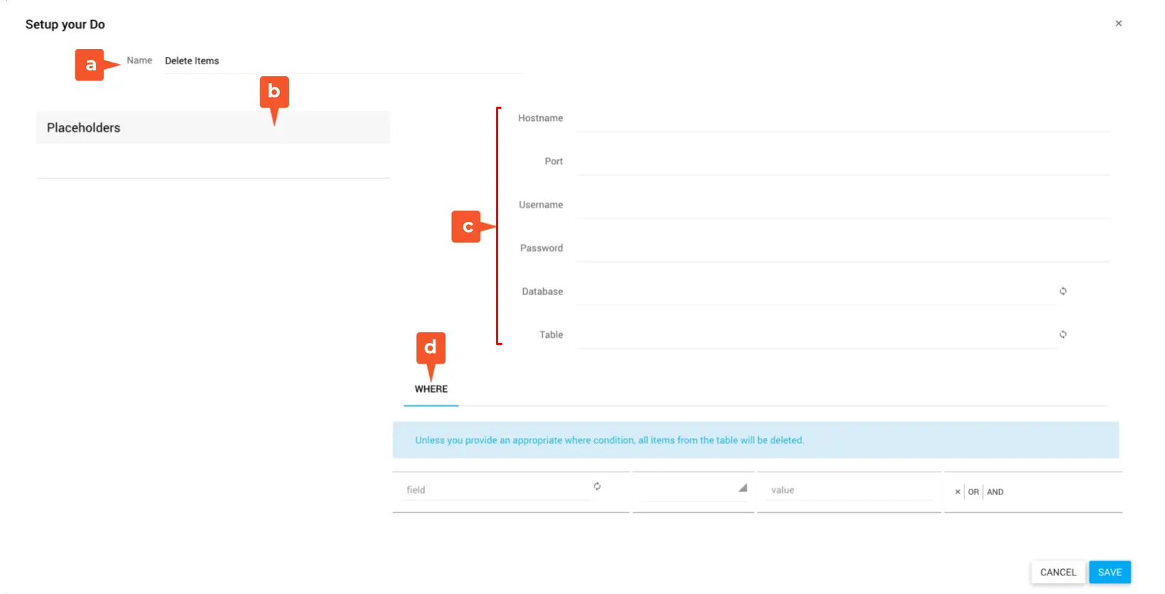 Mit dem Baustein Delete Items können Datensätze in einer externen MSSQL-Datenbank gelöscht werden.