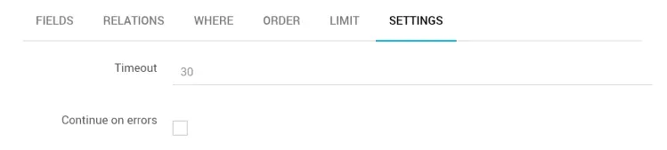 - Continue on errors?: Wenn aktiviert, läuft die Abfrage auch dann weiter, wenn das Zeitlimit erreicht wurde. Es wird jedoch eine Fehlermeldung im Statusmonitor ausgegeben.