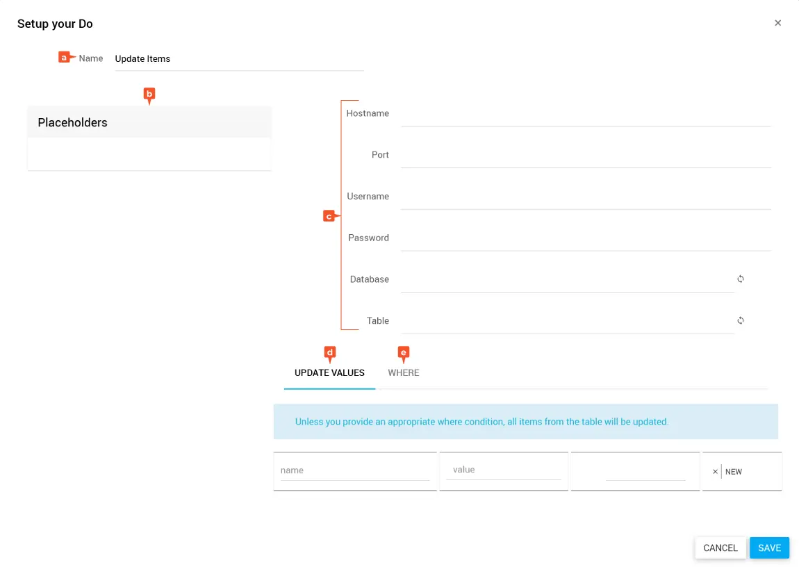 Mit dem Baustein Update Items können bestimmte Datensätze in einer externen MSSQL-Datenbank aktualisiert werden.