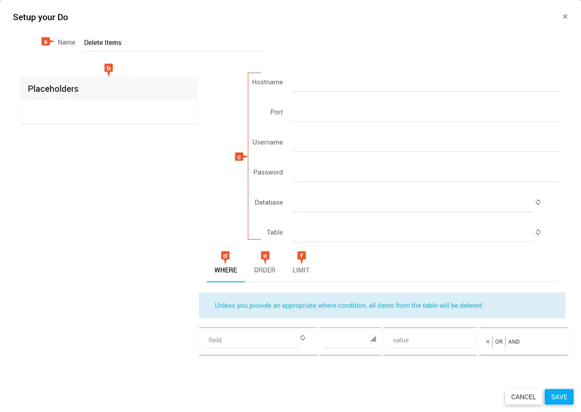 Mit dem Baustein Delete Items können Datensätze in einer externen MySQL-Datenbank gelöscht werden.