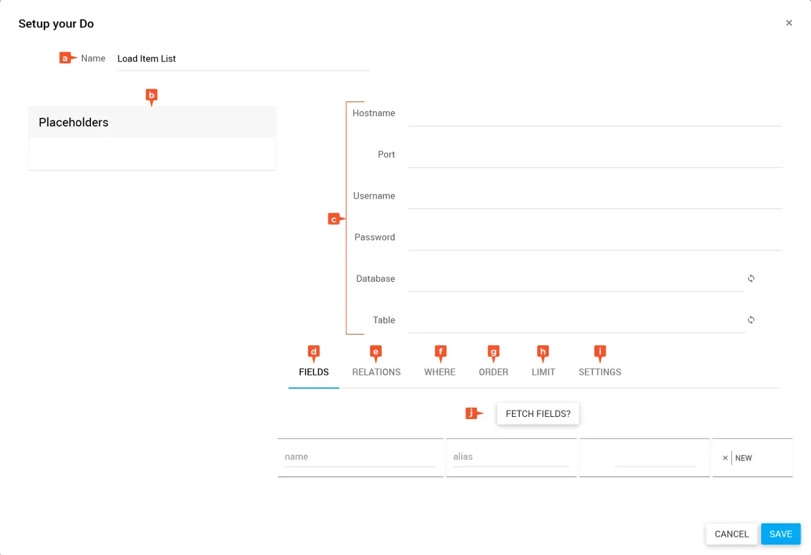 - FIELDS: Definition der Datenstruktur mit den Daten, die im Workflow zur Verfügung gestellt werden. Die Datenstruktur kann, bei erfolgreicher Verbindung mit der MySQL-Datenbank, automatisiert über die Schaltfläche FETCH FIELDS? angelegt werden oder manuell. Siehe auch Datenstrukturen anlegen.