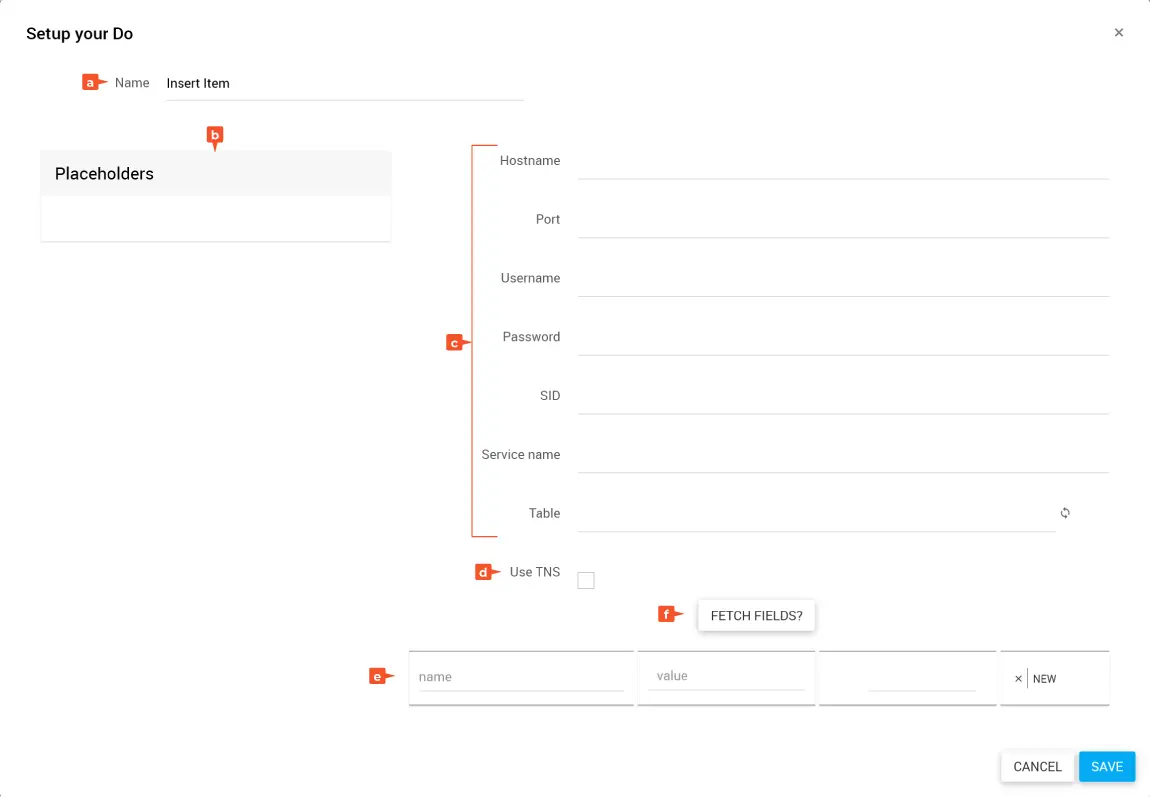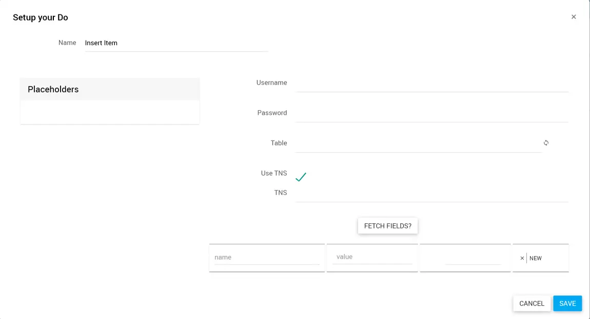 Gib im Feld Name eine treffende Bezeichnung ein. Zum Beispiel: „Insert Item Oracle-DB“