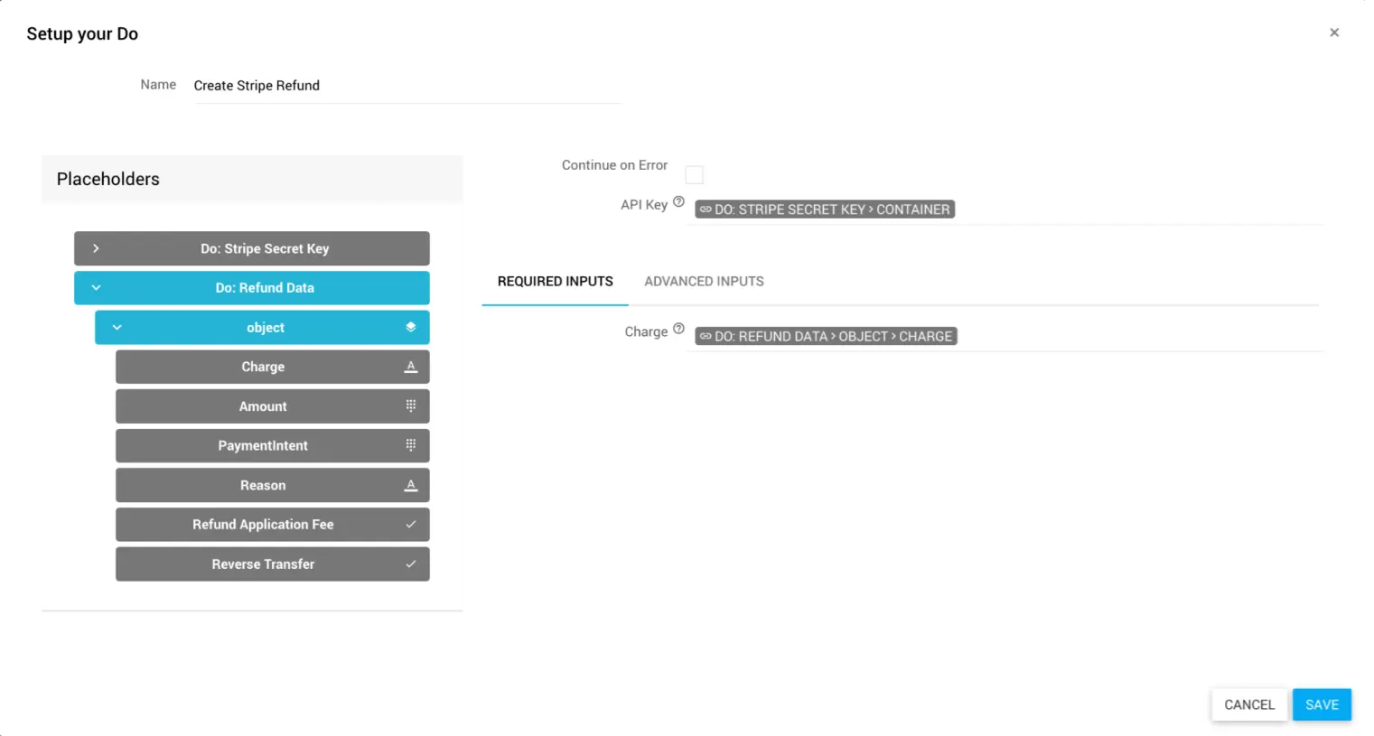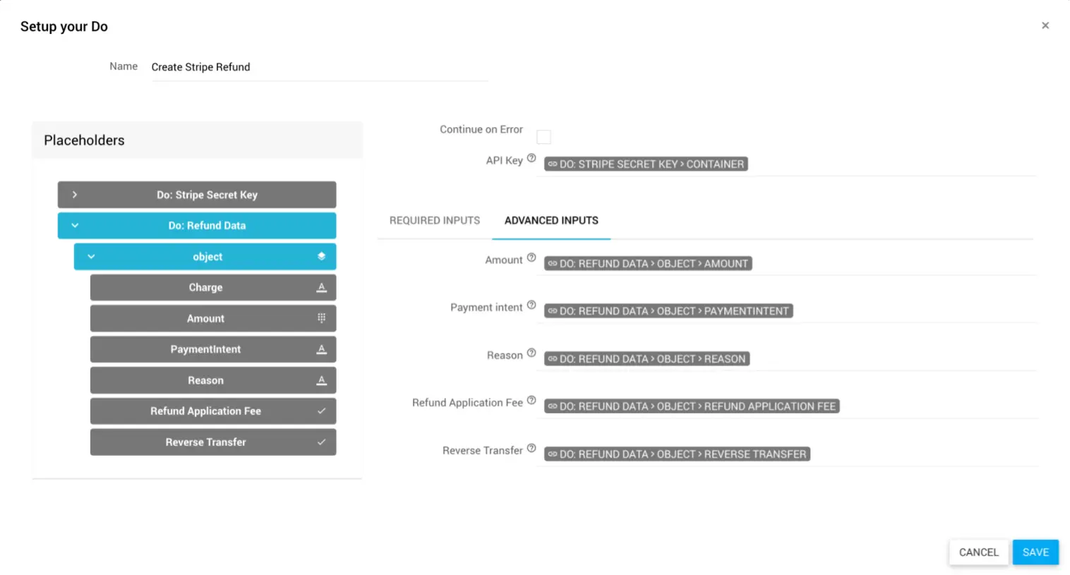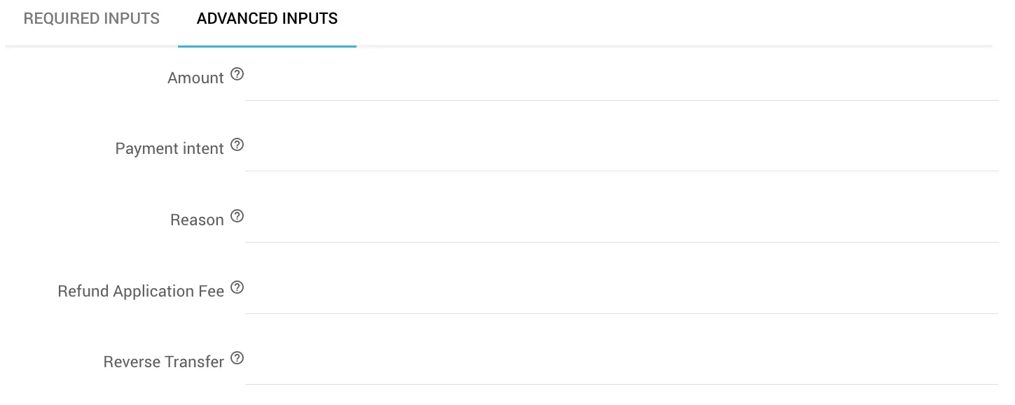 - Konfiguriere die Advanced Inputs mit den benötigten Daten zu Amount (Integer), Payment Intent (String), Reason (String), Refund Application Fee (Boolean) und Reverse Transfer (Boolean)