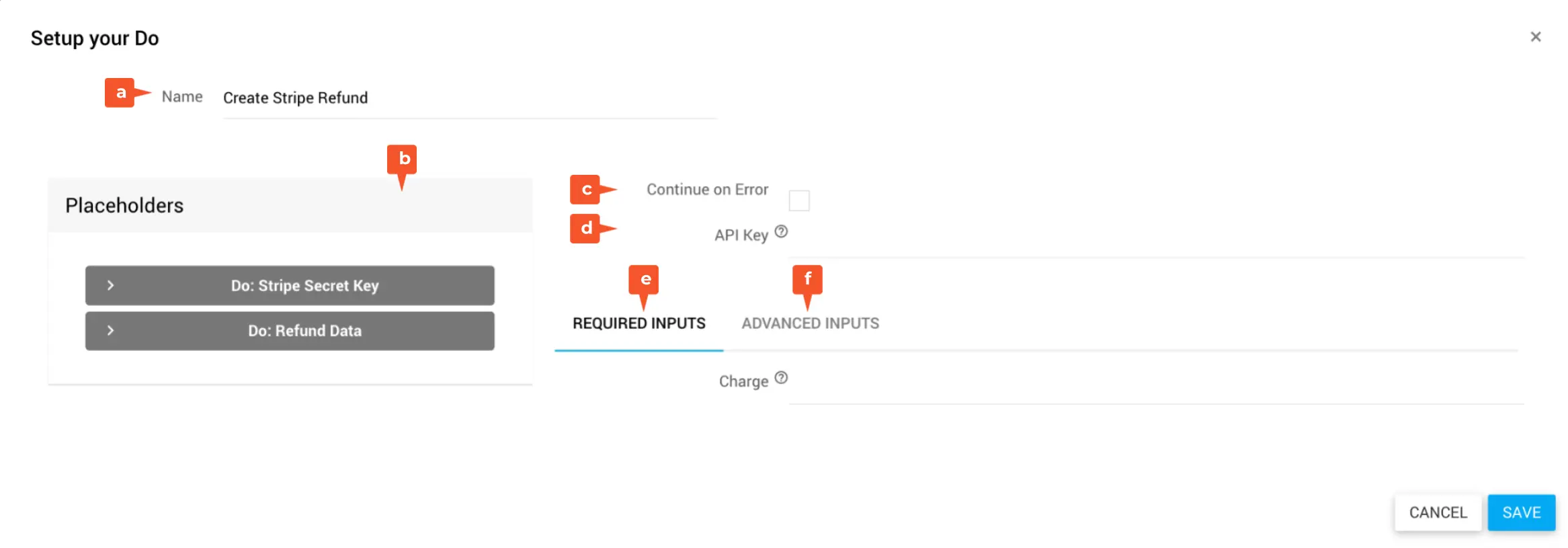 Definiere den Zahlungsauftrag für die Erstattung, in dem du Charge (String) im Required Input zuweist