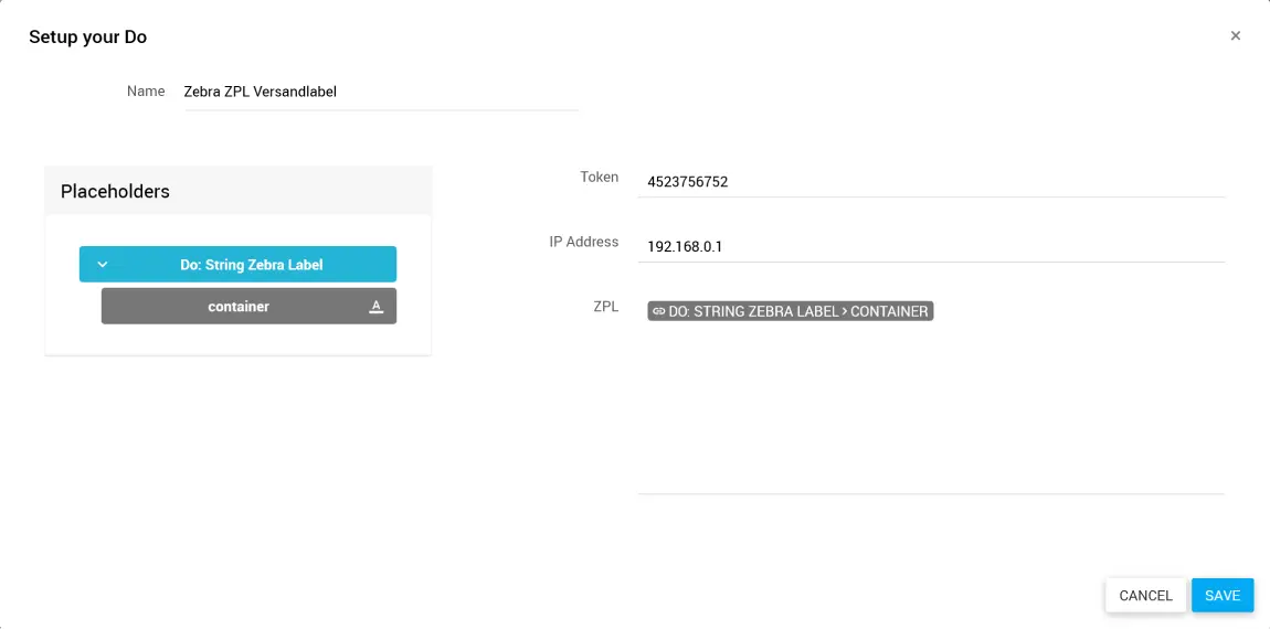Ziehe den Platzhalter mit dem ZPL-Code aus den Placeholders in das Feld ZPL.