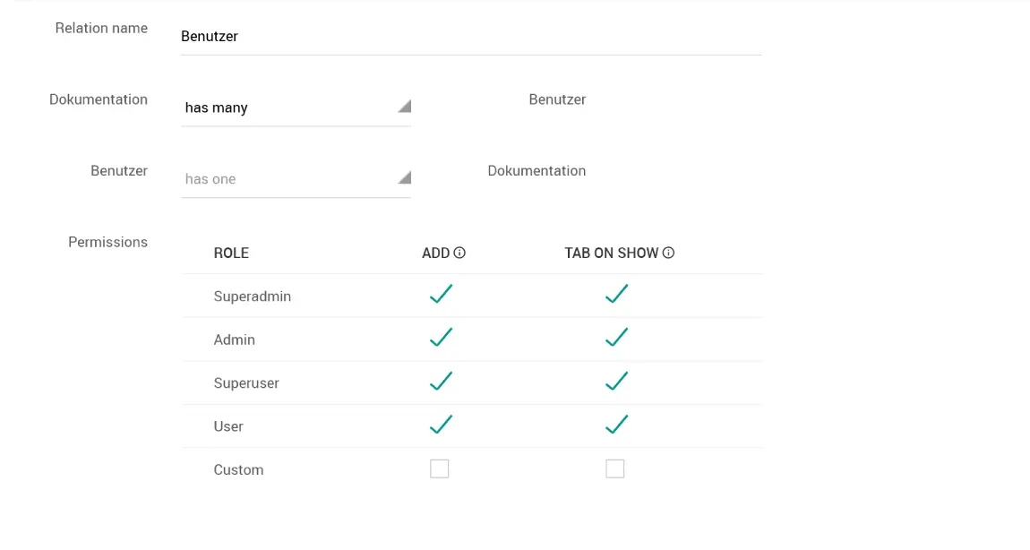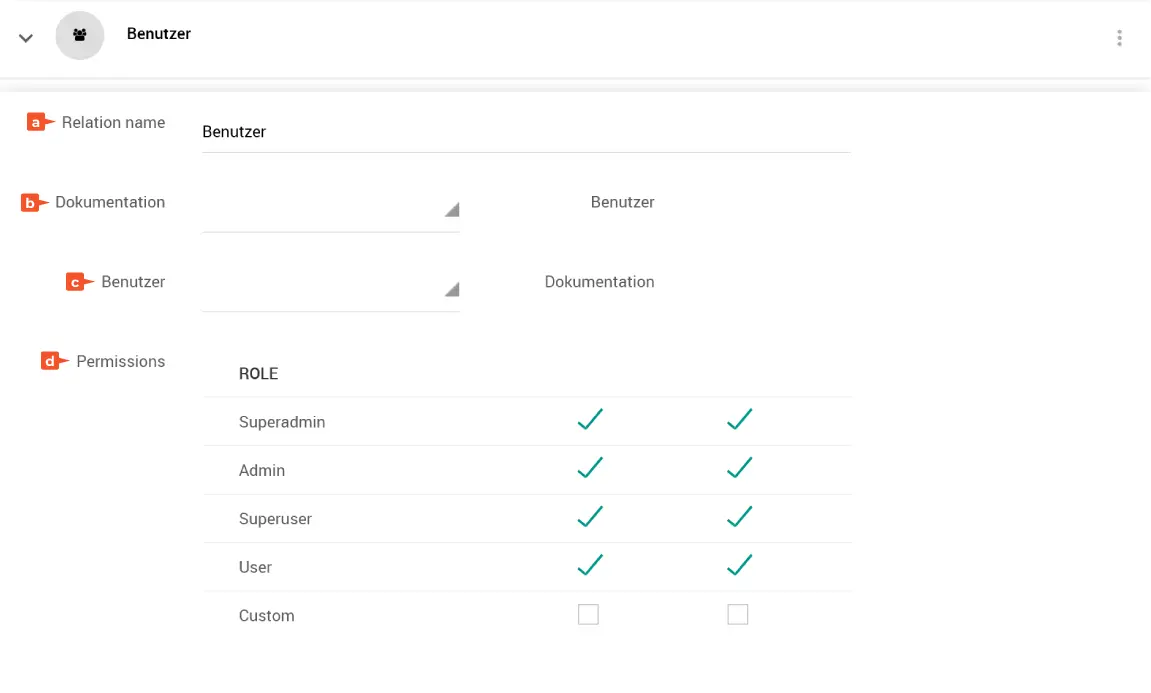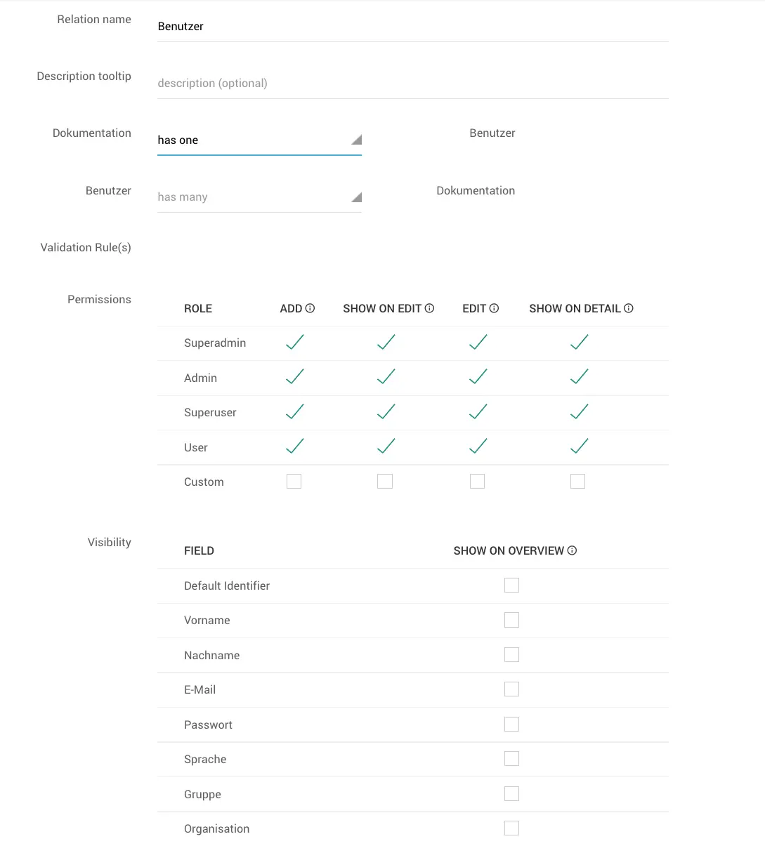 - Permissions: Die konfigurierbaren Berechtigungen sind abhängig von der gewählten Relation. Die Konfiguration selbst ist die gleiche wie für Datenfelder, siehe Permissions.
