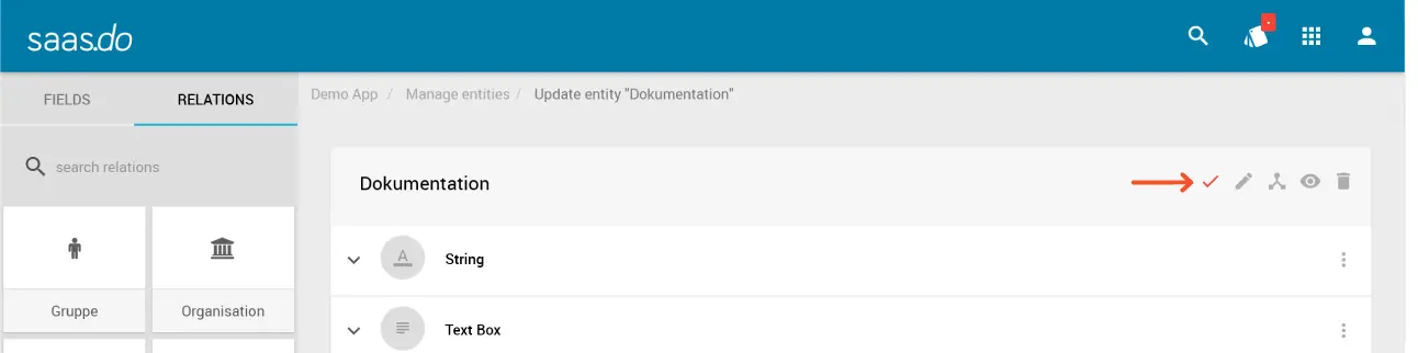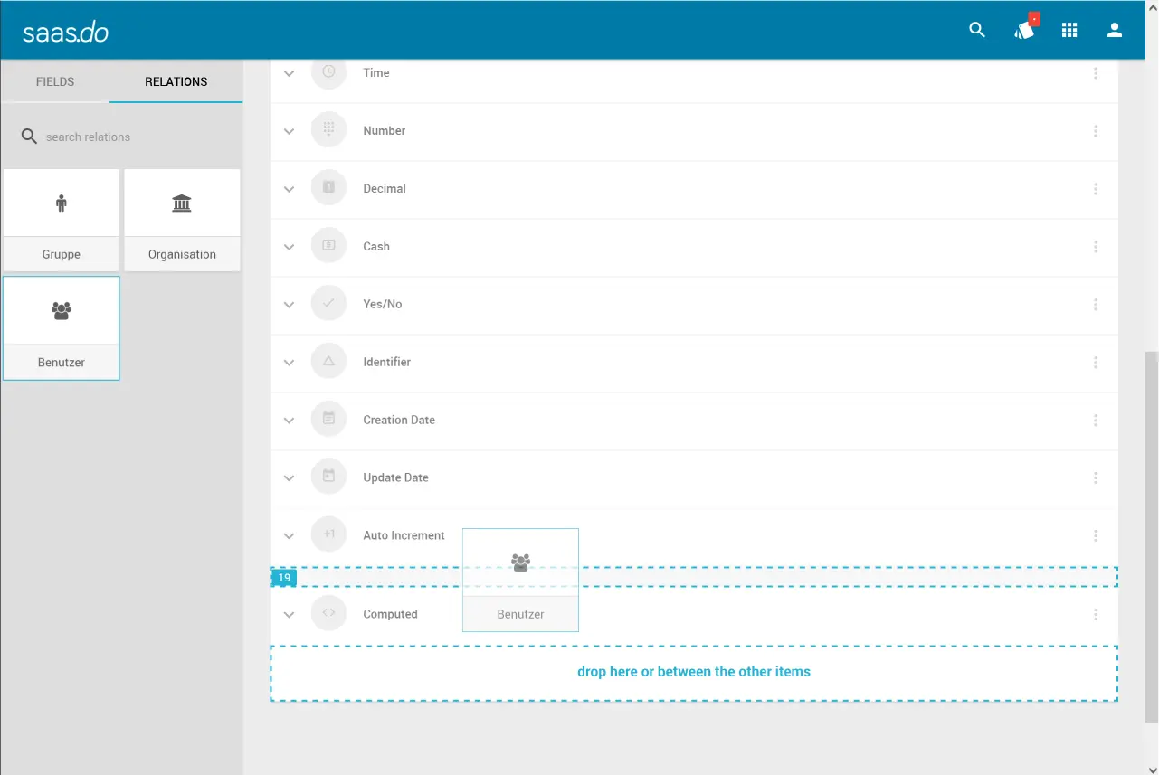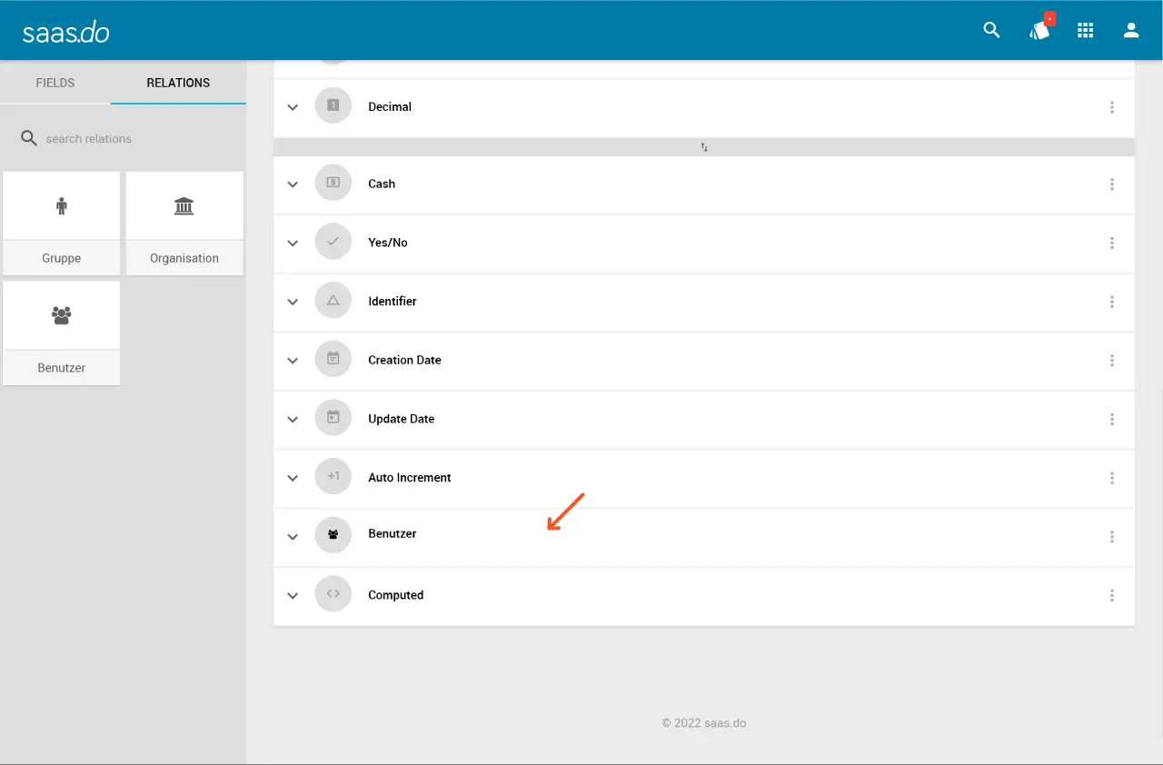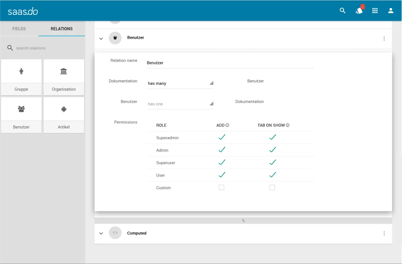 Eine Relation setzt Entitäten in Beziehung zueinander. In saas.do kannst du 1:n-Beziehung setzen. Zum Beispiel: 1 Firma hat X Mitarbeiter – 1 Mitarbeiter hat 1 Firma.