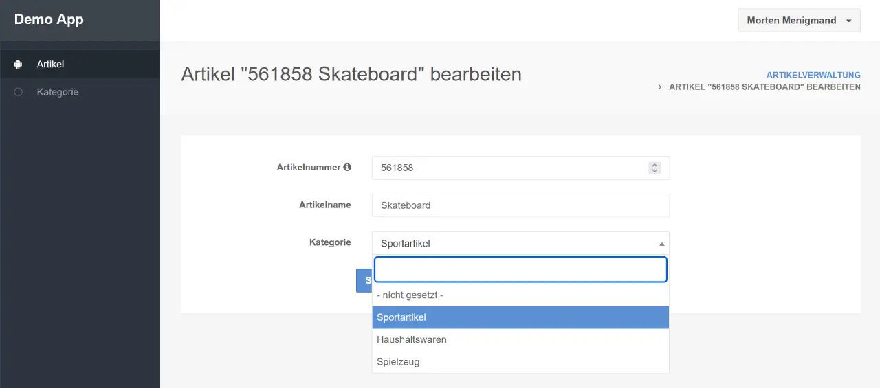Relationierte Entitäten aus has one-Beziehungen werden bei entsprechenden Berechtigungen als Auswahlfeld in der Detailansicht eines Datensatzes angezeigt. Siehe Permissions (Datenfelder).