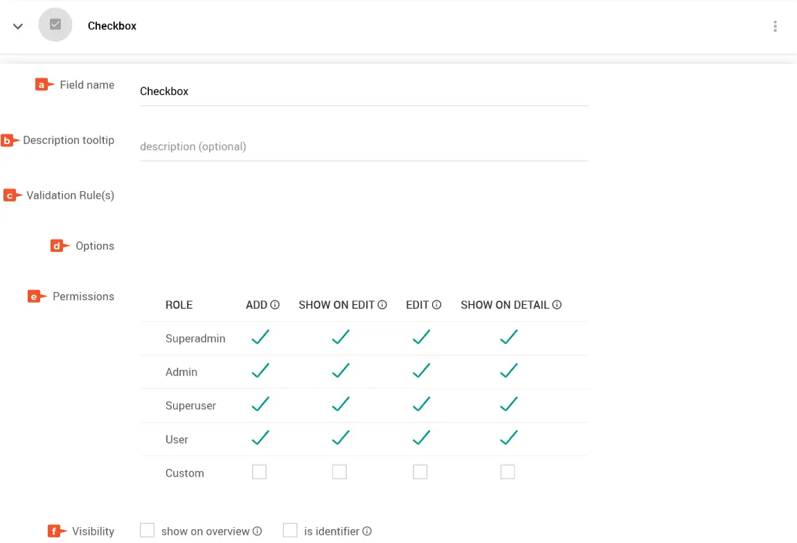 Permissions: Definition der Berechtigungen für dieses Datenfeld. Siehe Permissions.