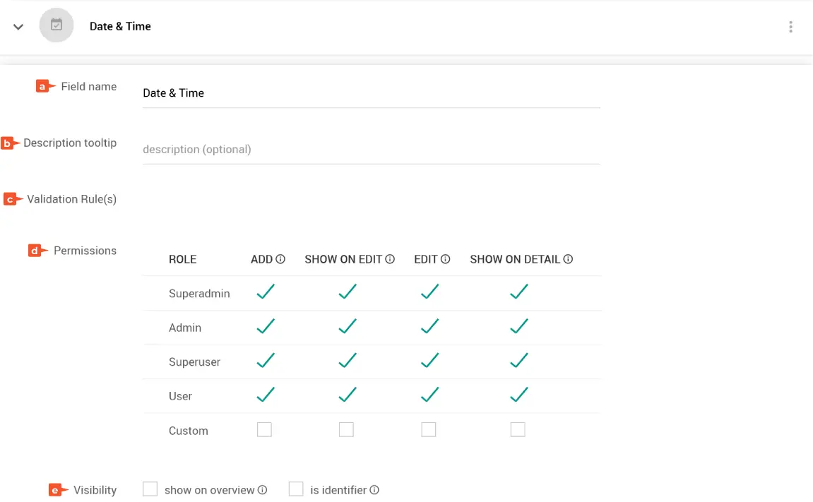 Permissions: Definition der Berechtigungen für dieses Datenfeld. Siehe Permissions.