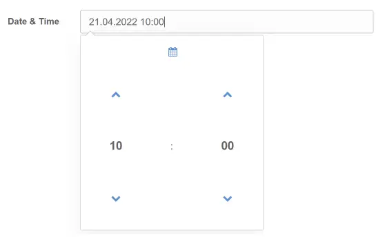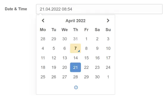 Das Datenfeld Date & Time ist ein Datums- und Zeitauswahlfeld. Bei einem Klick auf das Feld, wird ein Kalender aufgerufen, aus dem der Benutzer das Datum und die Uhrzeit auswählen kann.