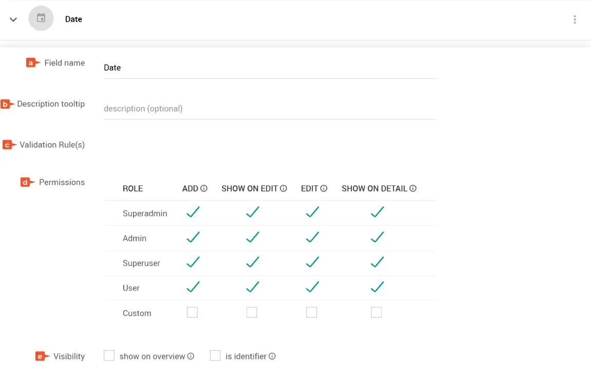 Permissions: Definition der Berechtigungen für dieses Datenfeld. Siehe Permissions.