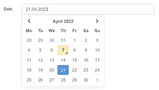 Das Datenfeld Date ist ein Datumsauswahlfeld. Bei einem Klick auf das Feld, wird ein Kalender aufgerufen, aus welchem der Benutzer das Datum auswählen kann.