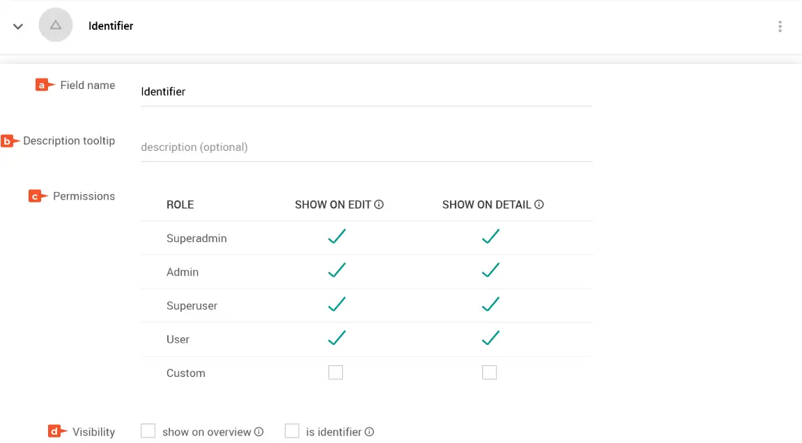 - Permissions: Definition der Berechtigungen für dieses Datenfeld. Siehe Permissions.