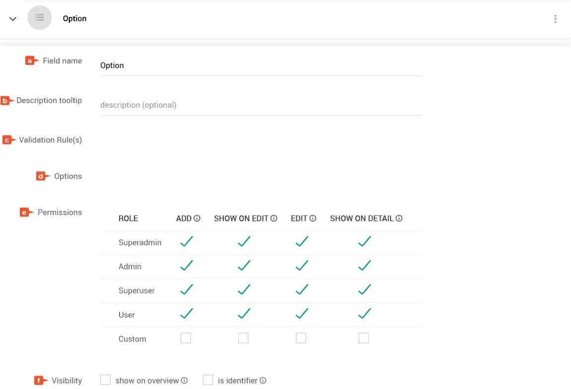 - Permissions: Definition der Berechtigungen für dieses Datenfeld. Siehe Permissions.